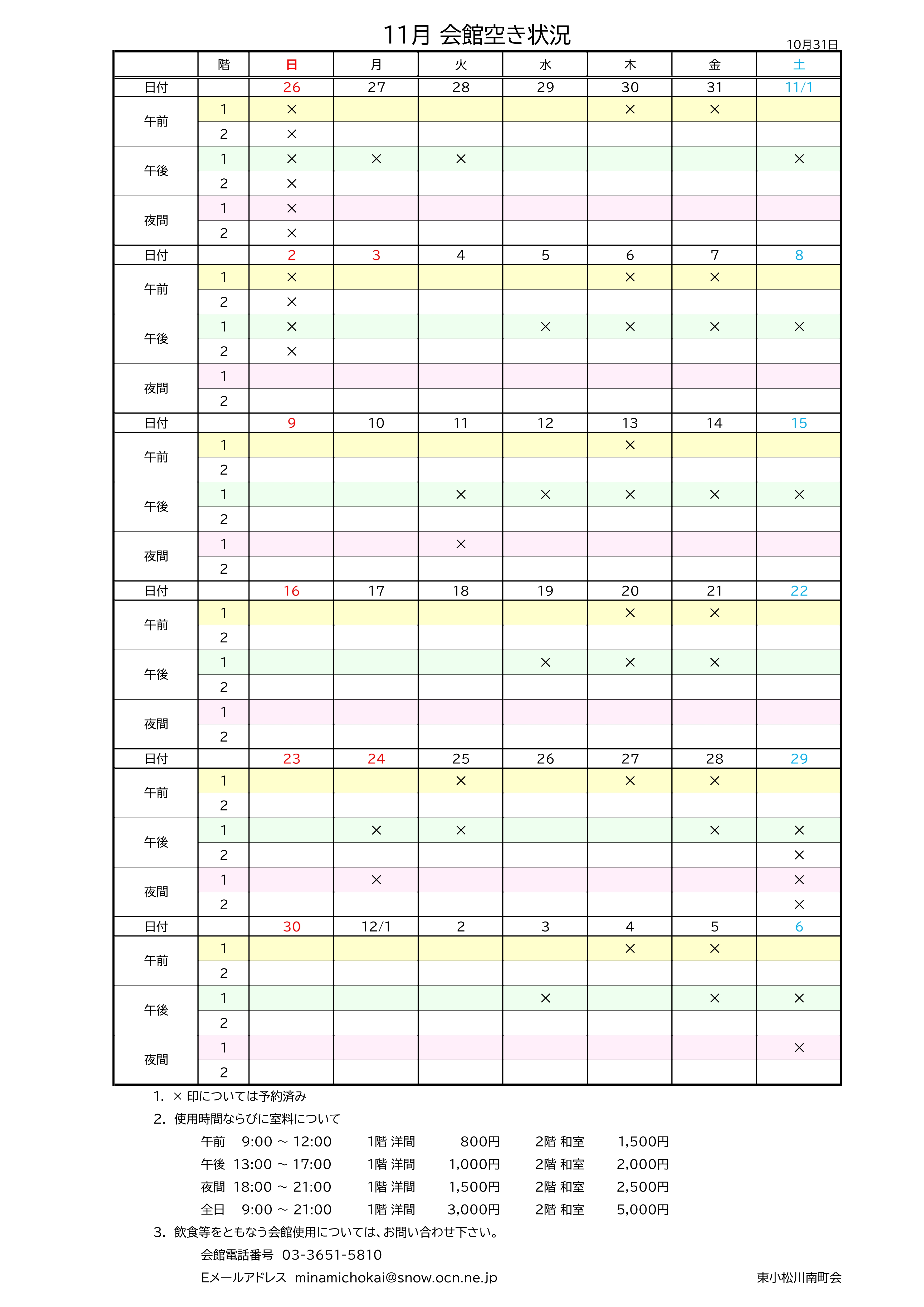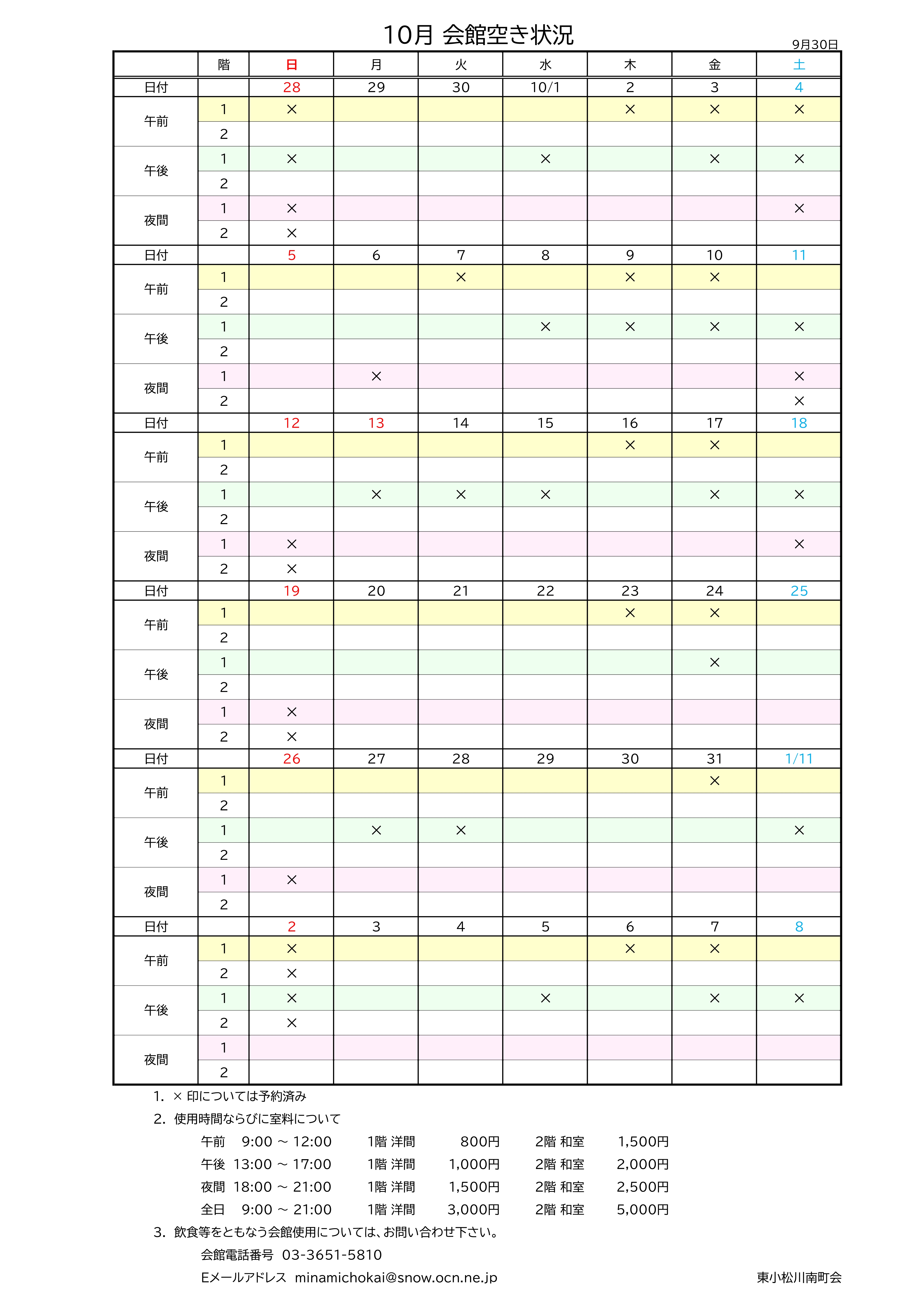 使用料は、当日かその前に会館事務所に直接お支払いください。